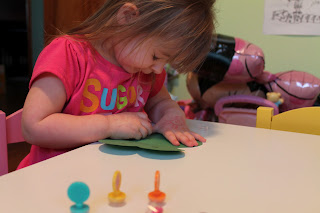 Once the roll was dry we started working on our butterflies wings. Belle picked out green for the wings. I pulled out her stampers and let her decorate the wings with those. While she was decorating the wings I made the antennas but wrapping pipe cleaners around my permanent marker and gluing a pom pom onto each. Belle picked out purple for those.